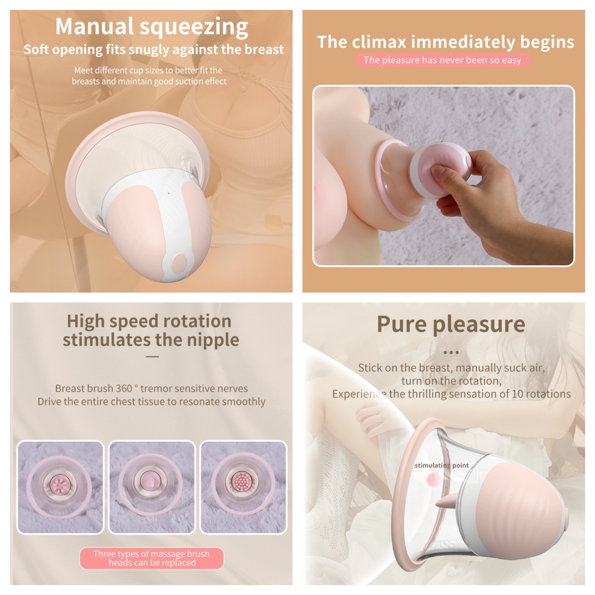 The innovative silicone brush head adds versatile stimulation. By gently massaging erogenous zones, it enhances blood flow and sensitivity. Meanwhile, the ergonomic shape fits securely against various cup sizes, from A to G.